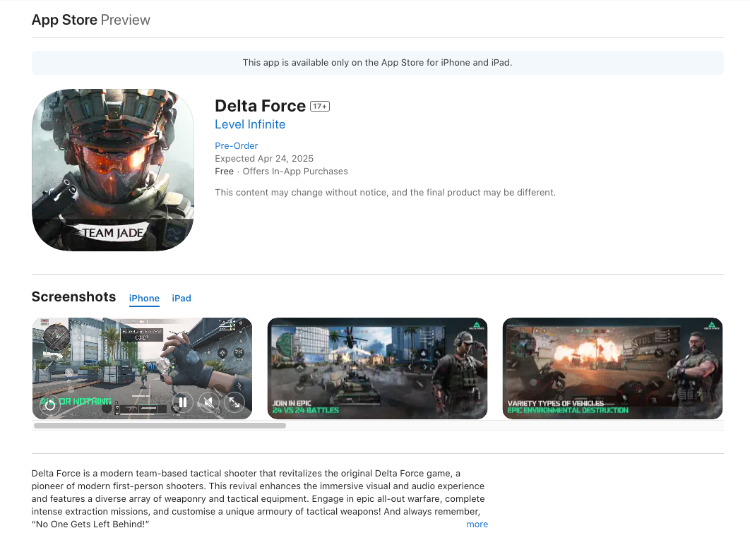App Store: https://apps.apple.com/us/app/delta-force/id6451399876