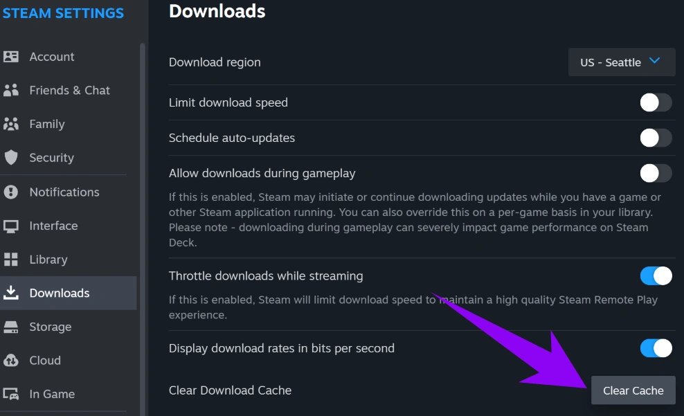 A cluttered Steam cache can lead to the cs2 stuck on connecting to counter strike network loop. This "washes" the temporary data that Steam uses to log you into various game services.