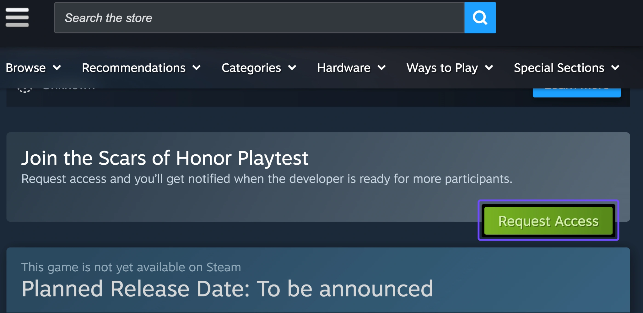 Step 3. Request Access: On the official store page, look for the section titled "Join the Scars of Honor Playtest." Click the green "Request Access" button.