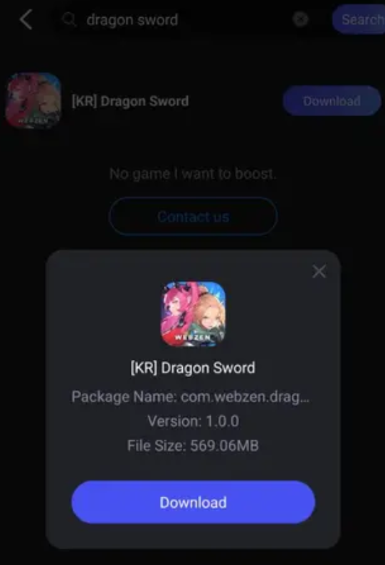 Step 1: Open LagoFast Mobile, search for "Dragon Sword," and tap the download button next to the search result.