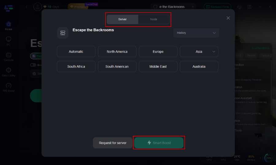 Step 5: Choose your preferred server node and click "Smart Boost" to start optimizing your network.