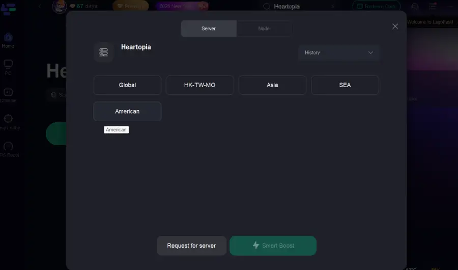 Step 5: Choose your preferred server node and click "Smart Boost" to start optimizing.