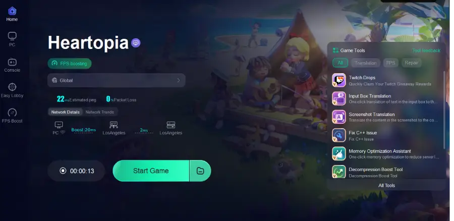 But it doesn’t stop there—Lagofast also helps with network issues, lowering ping, keeping your connection stable, and optimizing routing, while giving your FPS a boost and offering other handy in-game tools. With all that working together, you can actually enjoy Heartopia the way it was meant to be played, without struggling with language barriers or lag.