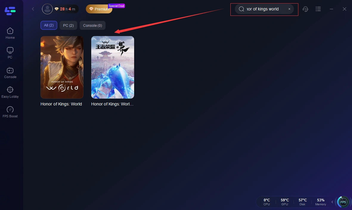 Step 2: Open LagoFast then click the PC button on the left and search Honor of Kings CN in the search bar, click it after appearing.