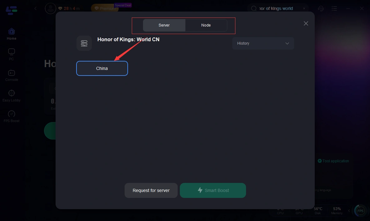 Step 3: Click on “Server” to change to a better server that ensures the gaming experience, then click on “Smart Boost”.