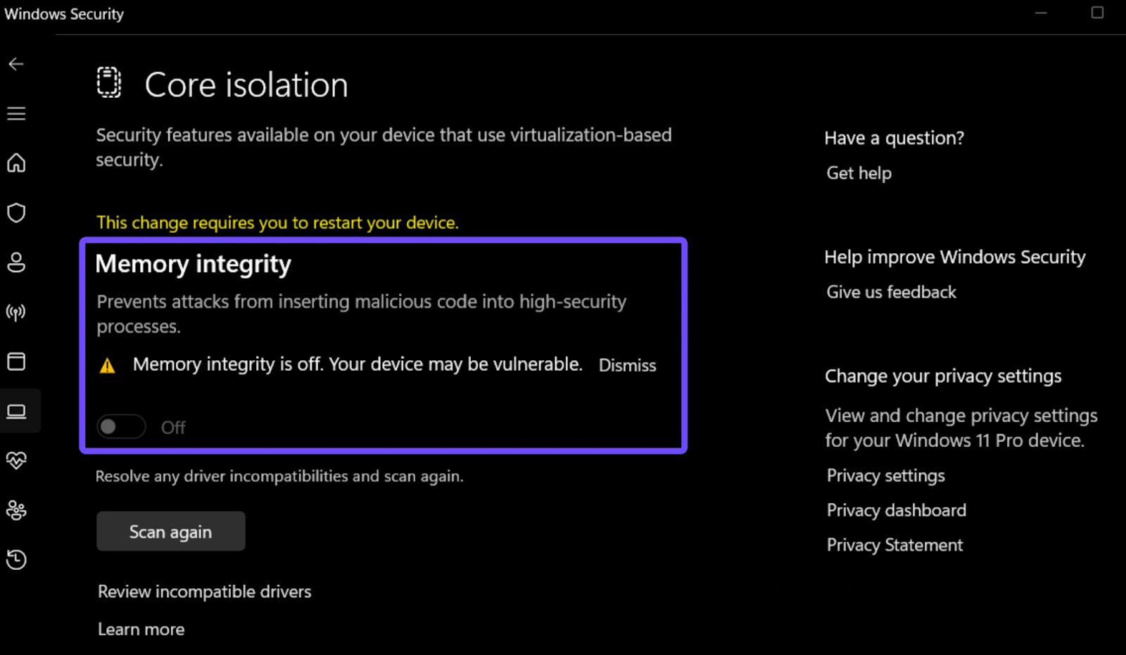 If Memory Integrity cannot be enabled, it usually means an incompatible driver is installed. Updating or removing conflicting drivers often resolves the issue.