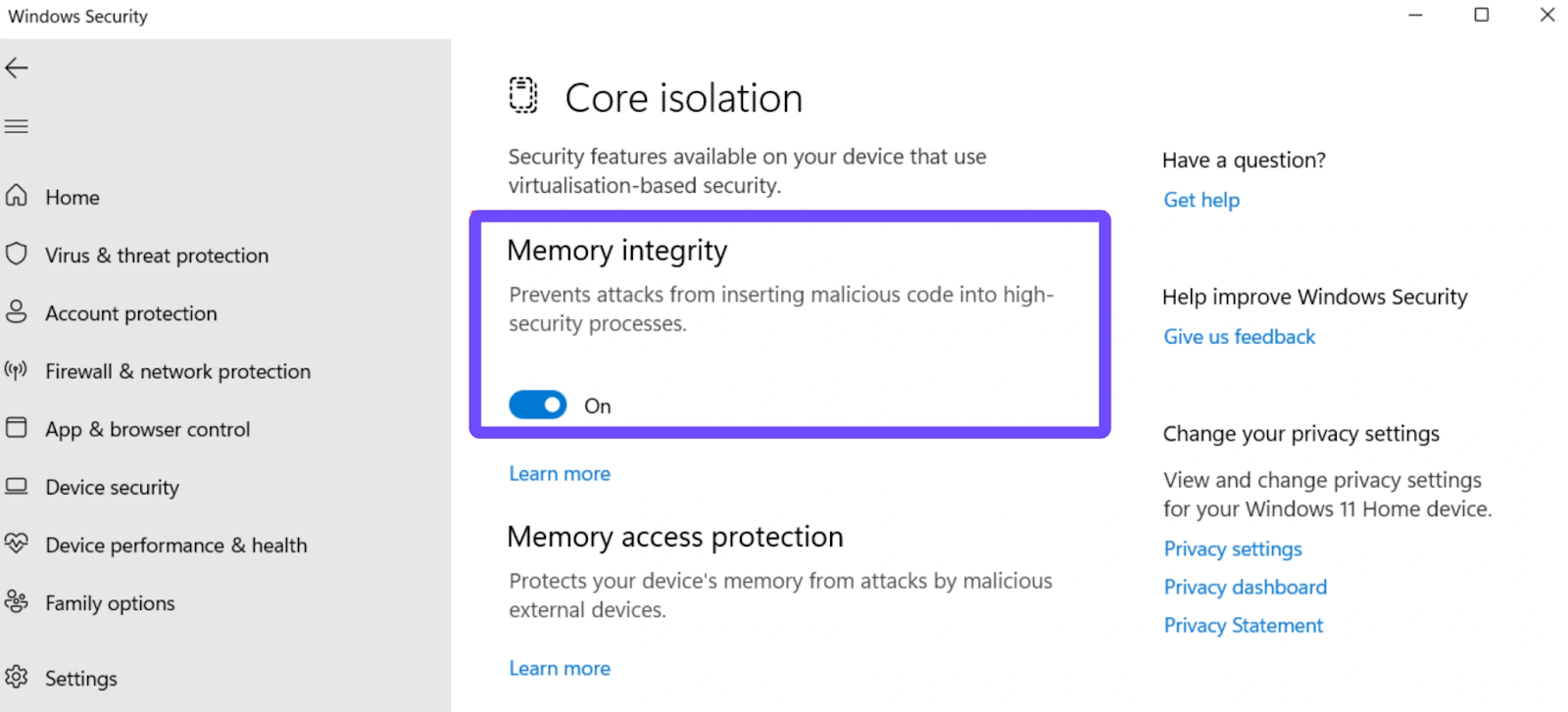 Step 6. Toggle Memory Integrity to ON.