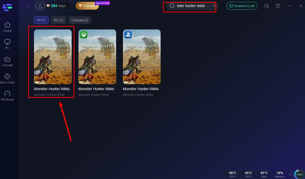 2. Locate Monster Hunter Wilds: Launch LagoFast, search for "Monster Hunter Wilds," and select it from the results.