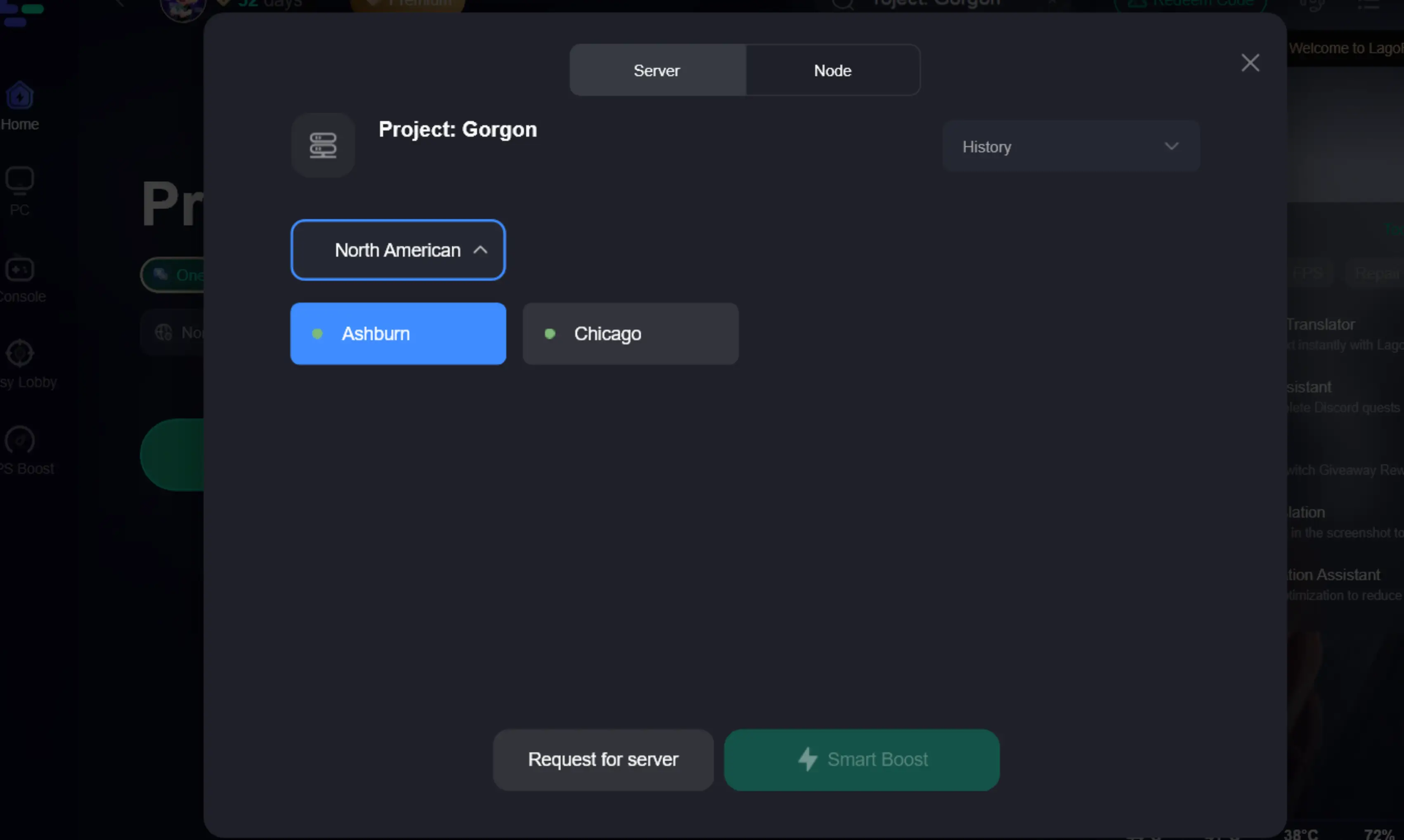Step 5: Choose your preferred server node and click "Smart Boost" to start optimizing.