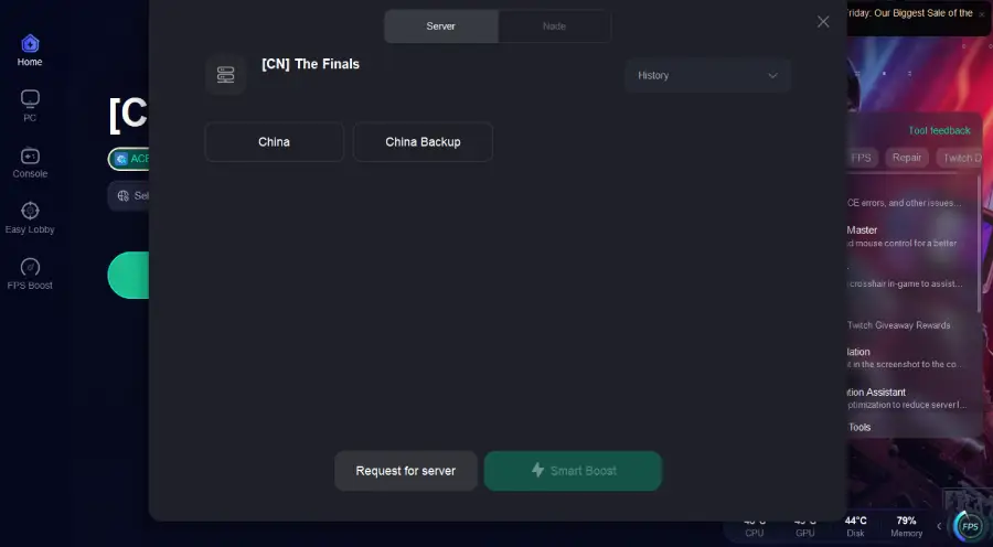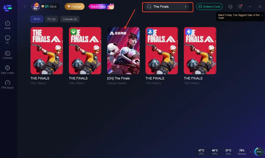 Step 2: Open LagoFast and search for “The Finals” in the search bar.
