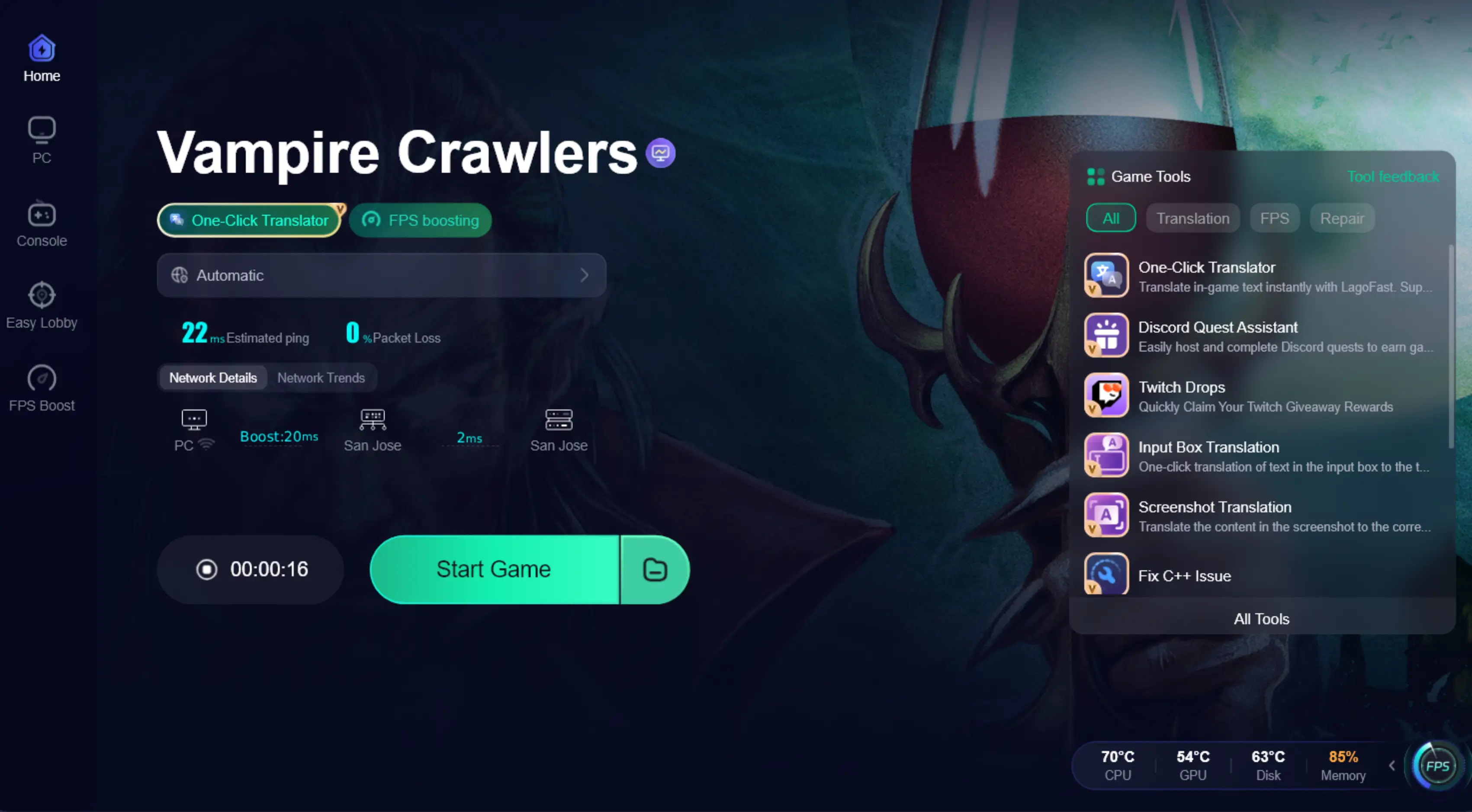Beyond translation, LagoFast also improves overall game performance. It helps stabilize connections, reduce ping, fix packet loss, and optimize routing, giving you a smoother and more consistent experience in fast-paced games like Vampire Crawlers.