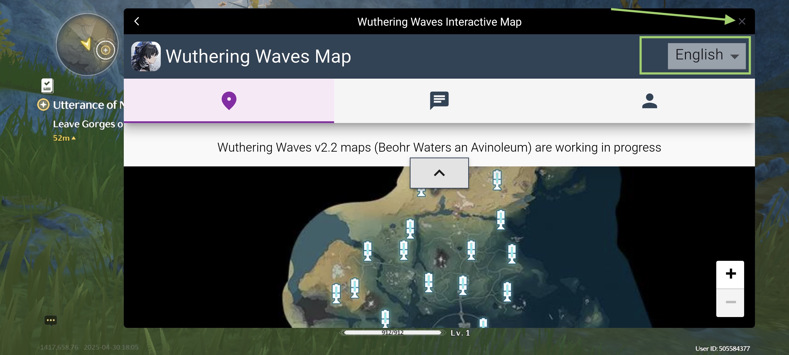 - Use it to locate loot, bosses, and hidden quests in real time—even mid-battle! You can switch the language here. And tap the "x" to close the map overlay.