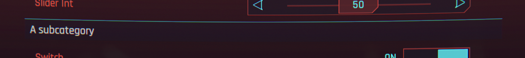 - Offers adding of new tabs and subcategories. Widgets are switches, sliders, list selectors, keybinds and buttons
