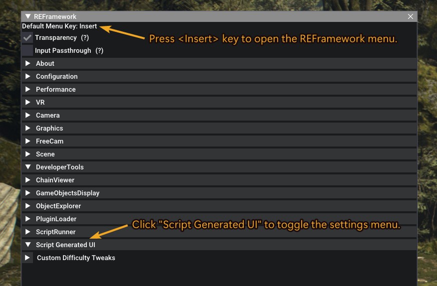 Press the Insert key on your keyboard to open the REFramework UI, then scroll to the bottom and expand the Script Generated UI section.