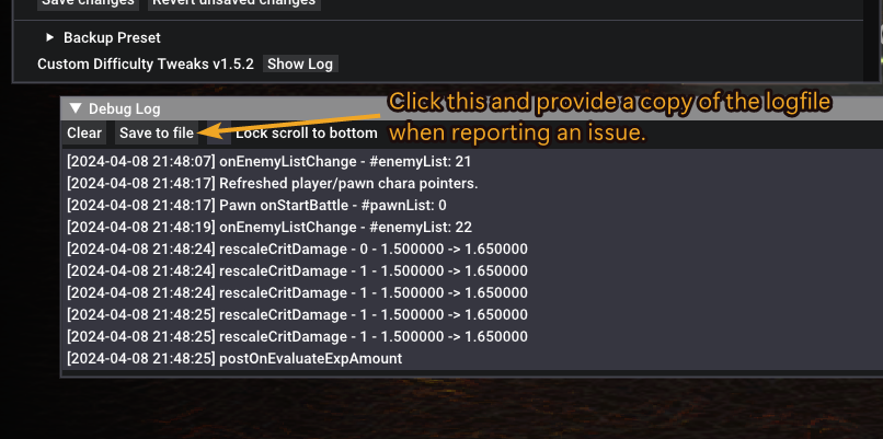 You can find this log at "/reframework/data/CustomDifficulty/log-xyz.txt", which is located wherever you installed REFramework (usually your steamapps folder).