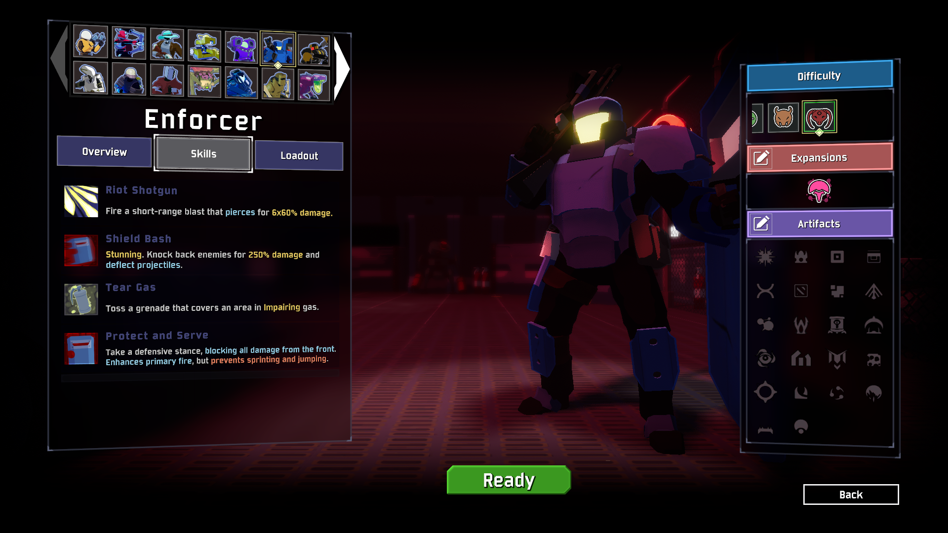 | Heavy Machine Gun | Unload a barrage of bullets for 130% damage. While using Protect and Serve has increased accuracy, but slower movement speed. |