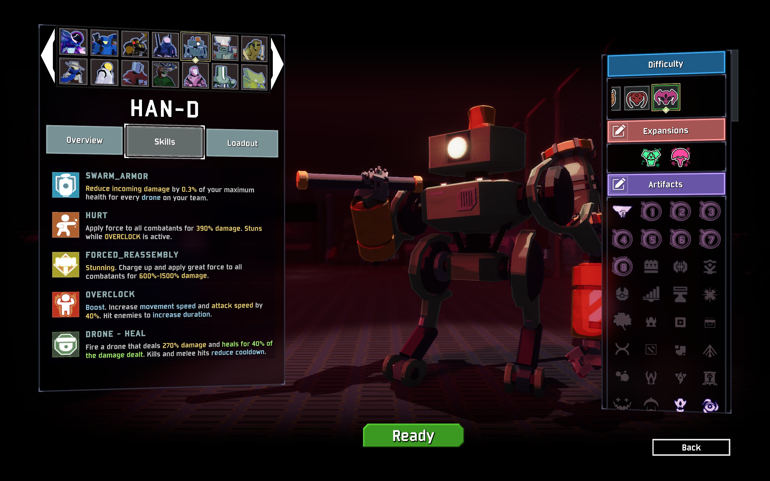 HAN-D is a tanky melee survivor who can heal himself and his allies to stay in the fight. His melee attacks have high knockback, and comboing them properly will allow him to knock away even the heaviest enemies!