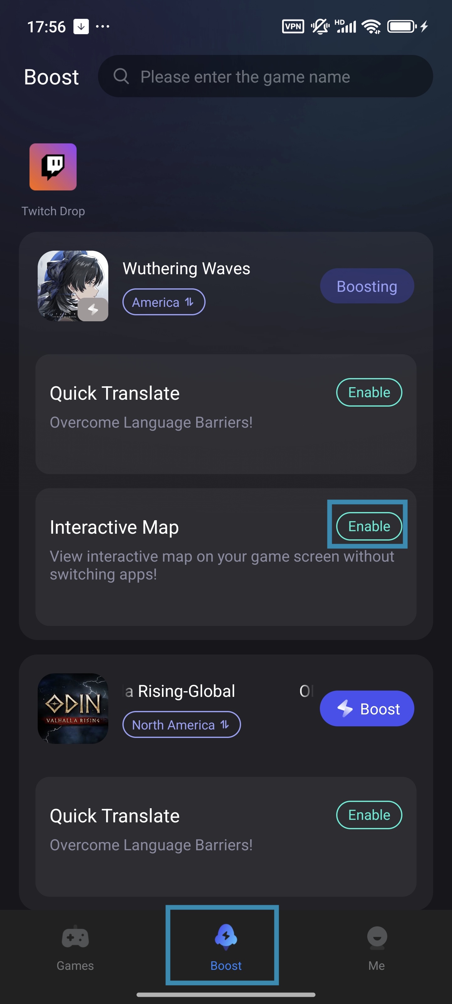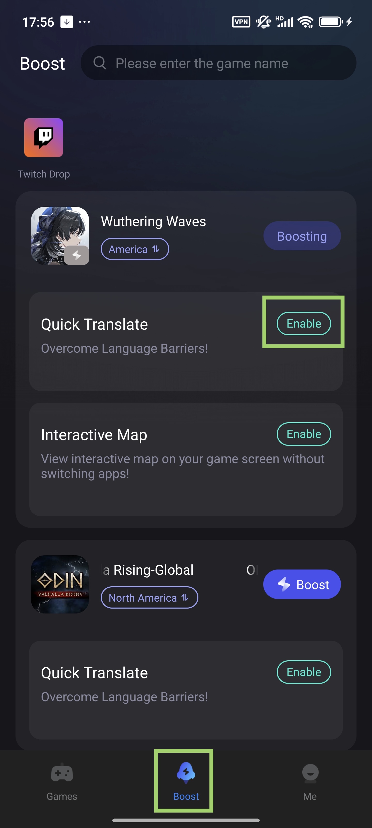 - Go to Boost tab, find Wuthering Waves and tap the enable button to activate the translation tool.