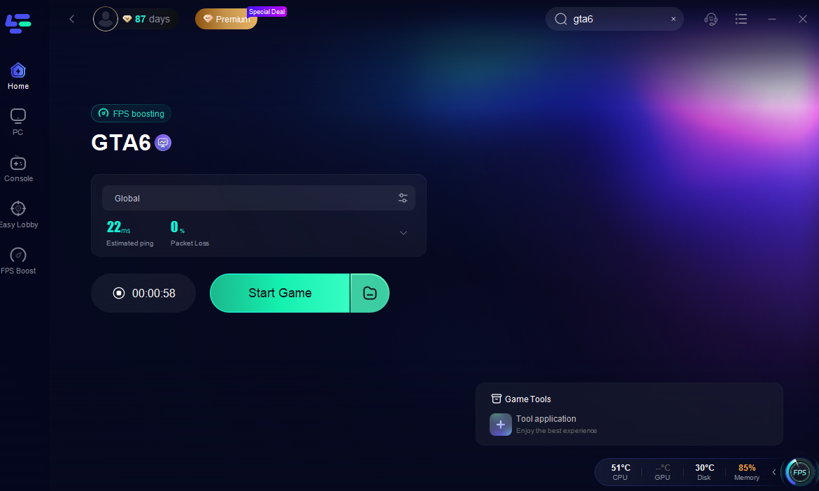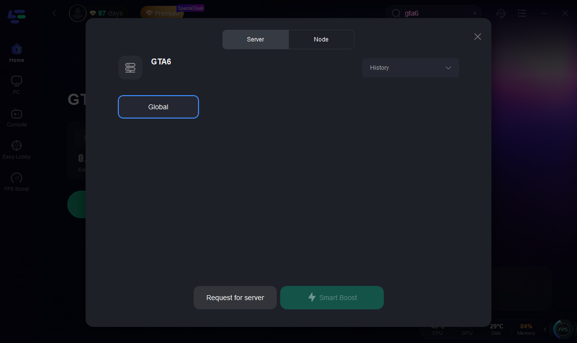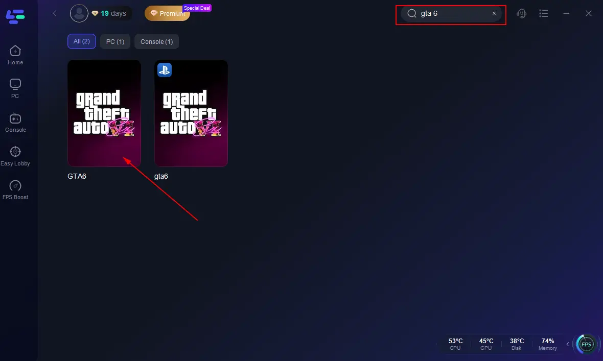 Étape 2 : Ouvrez LagoFast, cliquez sur le bouton PC à gauche, recherchez GTA 6 dans la barre de recherche, et cliquez dessus après la présentation.