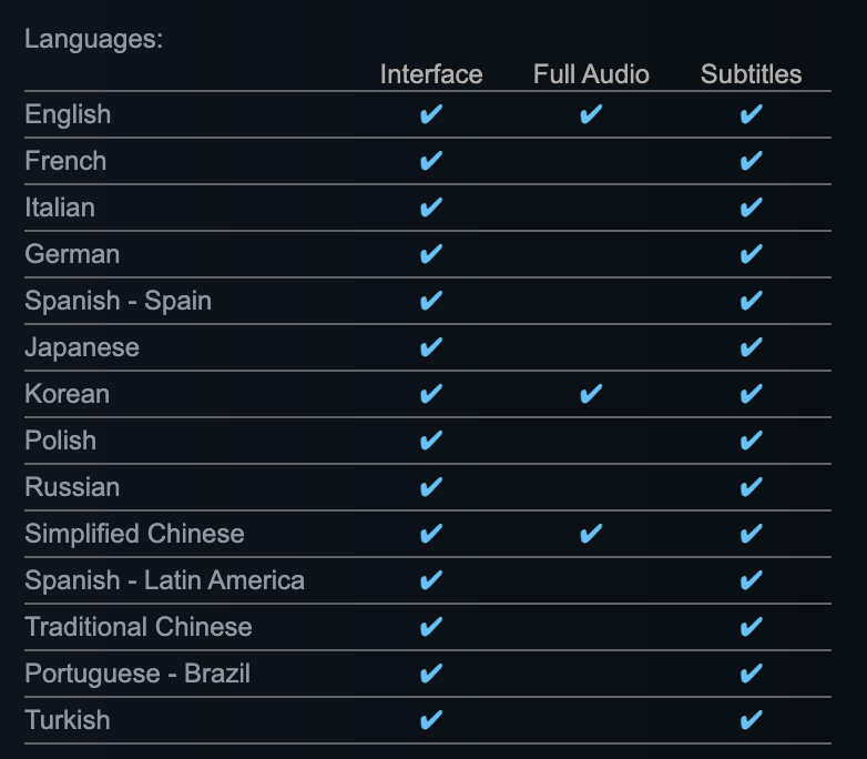 У грі доступні такі мови для інтерфейсу та субтитрів: